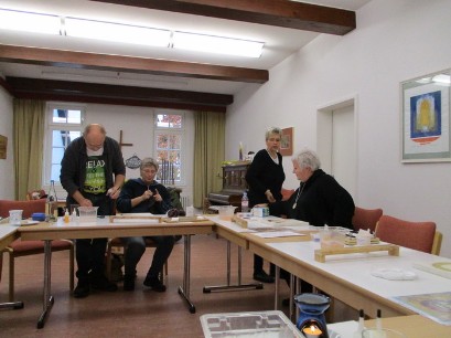 Im Hintergrund hören wir leise orthodoxe Gesänge und Weihrauch liegt in der Luft. Teilnehmer aus ganz Deutschland arbeiten unter Anleitung des Ehepaares Horvat, Leiter einer eigenen Malschule in Hofheim im Taunus, an ihren Ikonen, manche meditierend ganz in ihre Arbeit vertieft, während andere sich auch unterhalten.